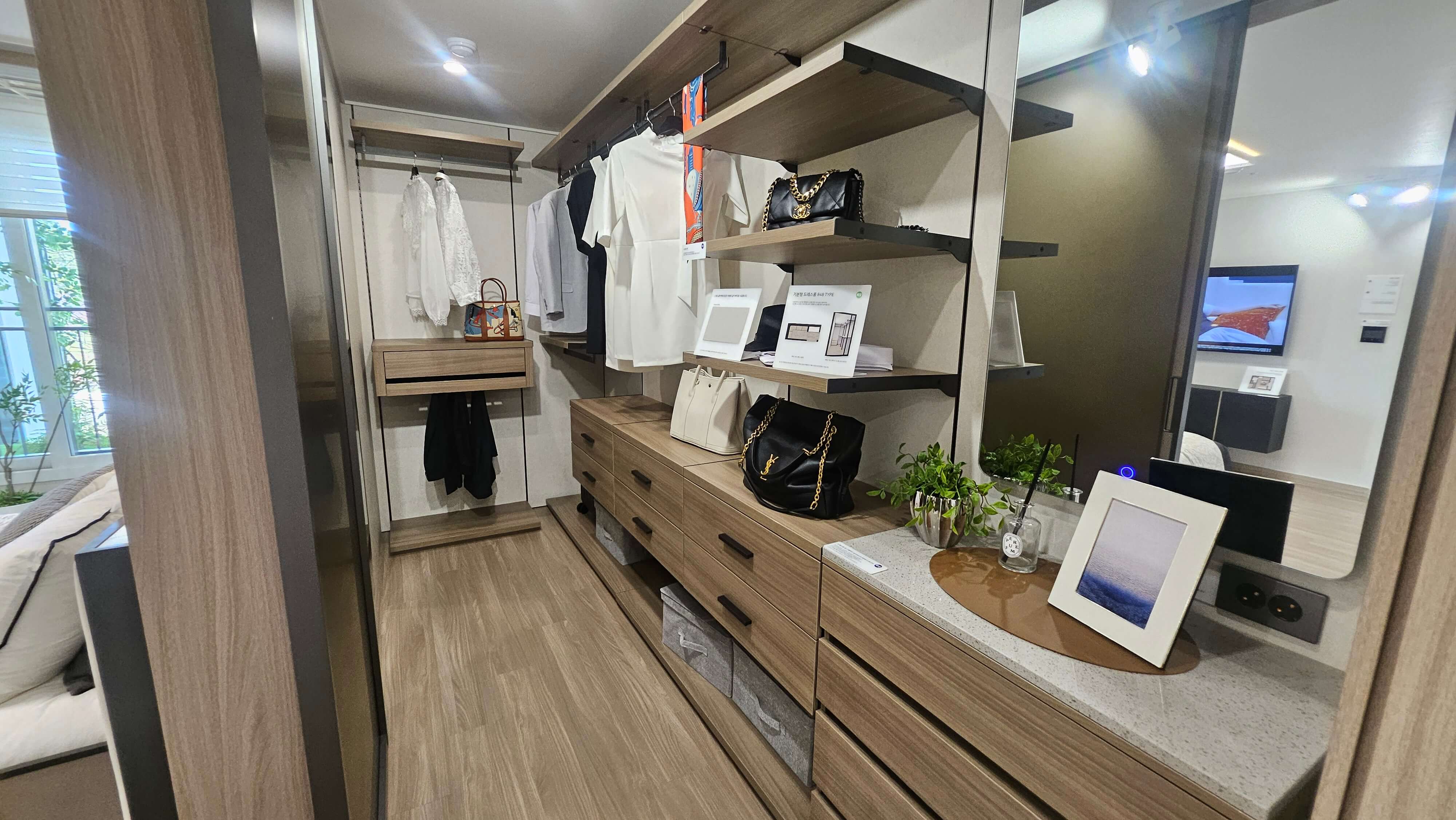 안방에는 시스템 드레스룸이 시공되어 여유로운 수납이 가능하며, 워크인 팬트리와 주방 수납장으로 공간 활용도를 높였습니다.