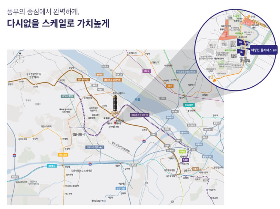 해링턴플레이스 풍무는 김포골드라인 풍무역에서 도보 약 10분 거리로, 향후 서울지하철 5호선 연장 노선이 연결되면 더블역세권으로 도약할 가능성이 큽니다.