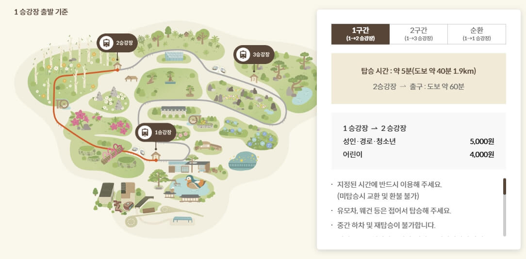 대부분의 방문객은 1구간만 예매해 정상까지 올라간 뒤, 내리막길과 평지를 걸으며 내려옵니다. 걷는 재미와 풍경을 동시에 즐길 수 있기 때문이죠.