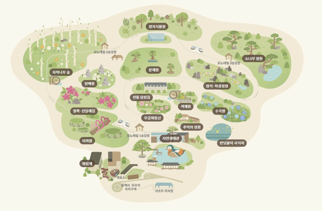 이외에도 국화원, 분재원, 전통 담장길 등 계절마다 다른 매력이 가득합니다. 여름에는 수국, 가을에는 단풍과 국화, 겨울에는 설경까지 이어져 사계절 내내 특별한 여행지를 선사합니다.