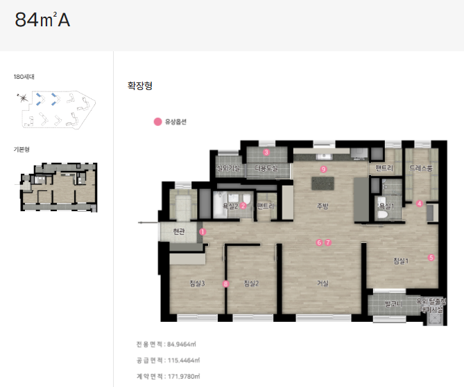 84D 타입: 3베이&타워형 구조, 116세대, 103동, 106동~107동에 배치, 앞산 조망 가능