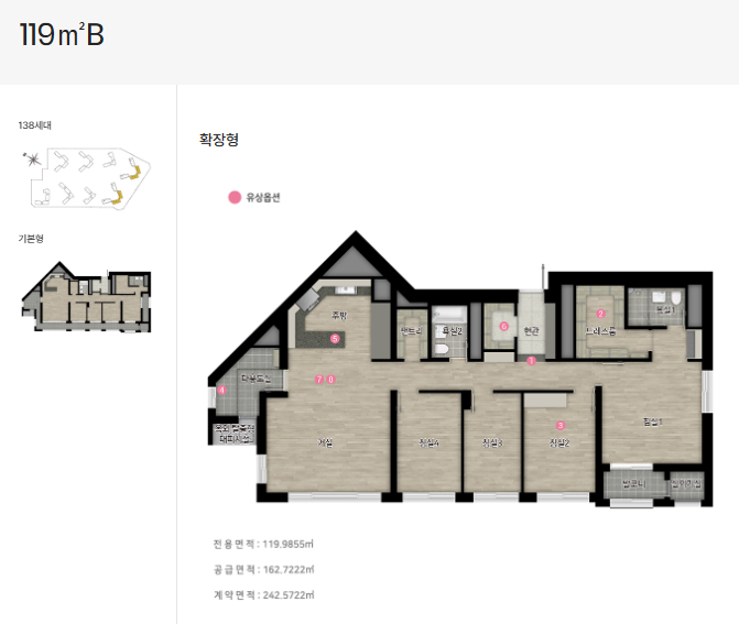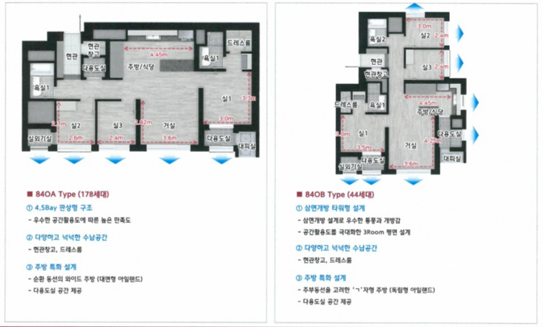 119B 타입: 138세대, 104동~105동에 배치, 5 베이 구조, 방 4개와 햇빛을 모두 받을 수 있는 구조