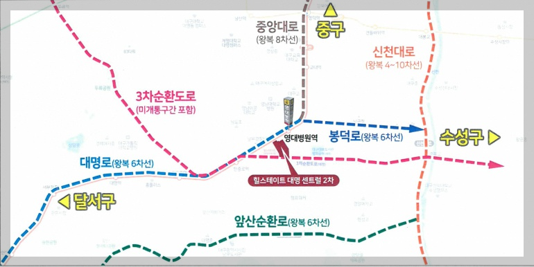 힐스테이트 대명 센트럴 2차는 대구지하철 1호선 영대병원역을 집 앞에서 승차할 수 있어 대구 시내로의 이동이 편리하며, 신천대로, 대명로, 앞산순환로 등을 통해 대구 시내 곳곳으로 빠르게 접근할 수 있습니다. 주변에는 학교와 의료시설, 쇼핑몰, 공원 등 생활 편의 시설이 많아 생활의 편리함을 높입니다.