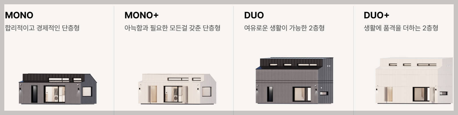 스마트코티지는 형태와 크기에 따라 ‘모노’와 ‘듀오’ 두 가지 모델로 나뉩니다. ‘모노’ 모델은 단층형 구조로 거실, 침실, 부엌, 욕실이 하나의 공간에 구성되어 있습니다. 반면 ‘듀오’ 모델은 복층형 구조로 1층은 생활 공간, 2층은 프라이빗 침실로 사용하여 공간 활용도를 높였습니다. 또한 LG 스마트코티지 공식 홈페이지에서 설치 부지 선정, 외부 및 내부 색상, 마감 소재 등의 옵션을 자유롭게 설정하여 자신의 취향에 맞는 코티지를 가상으로 확인하고 비용까지 사전에 알아볼 수 있습니다.