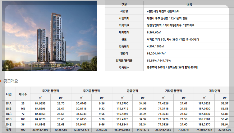 대전역을 걸어서 이용할 수 있는 역세권입지에 지하 5층에서 최고 39층 4개 동, 아파트 400세대 , 오피스텔 25실로전용면적 84㎡ 5개타입으로 대전광역시 동구 삼성동일원에 공급되며 대전역세권 개발사업에 따른 수혜와 도시재생 뉴딜사업, 혁신도시, 도심융합특구  대상지로 선정되며 다양한 개발사업이 동시다발적으로 추진되고 있습니다.