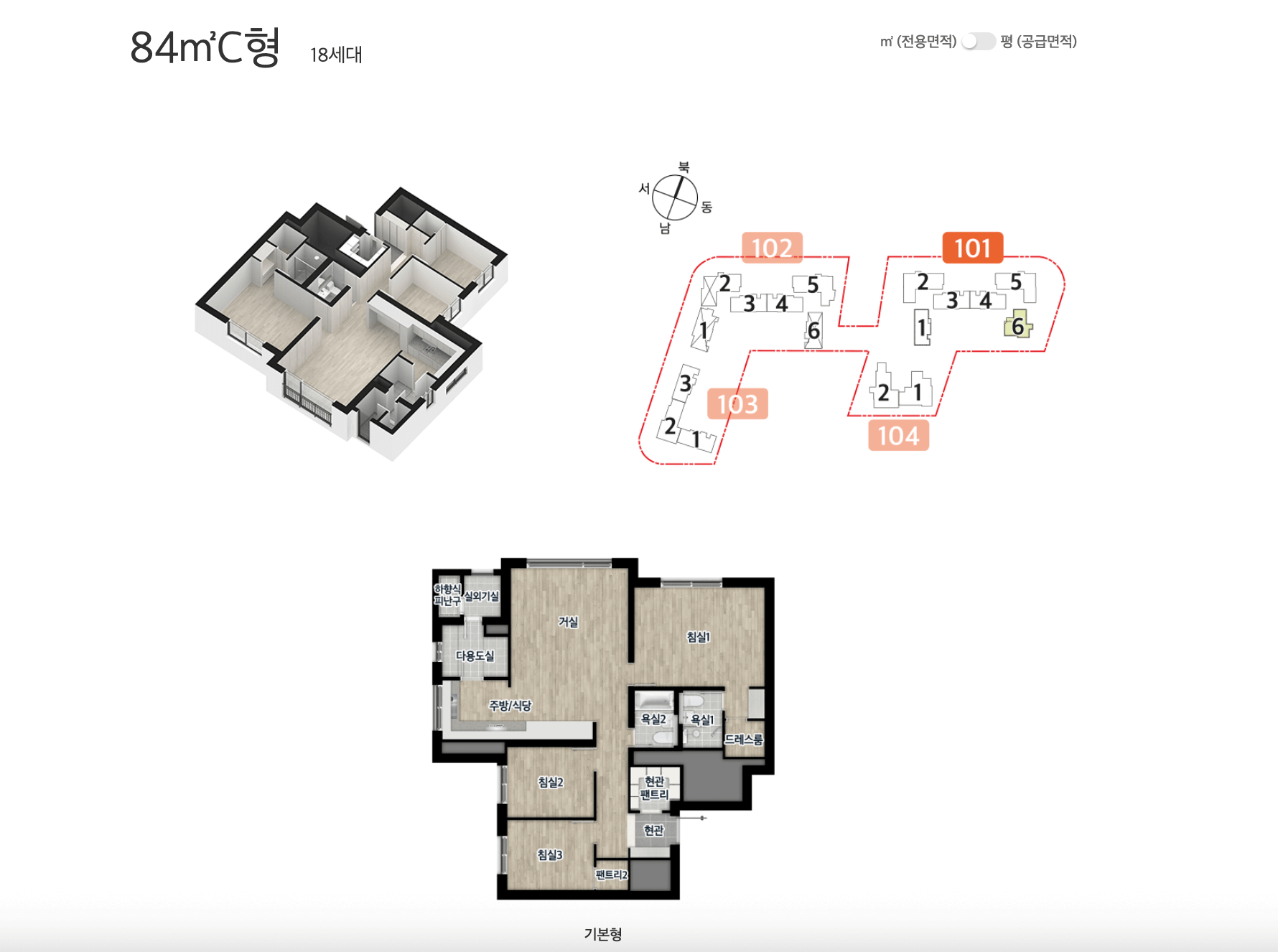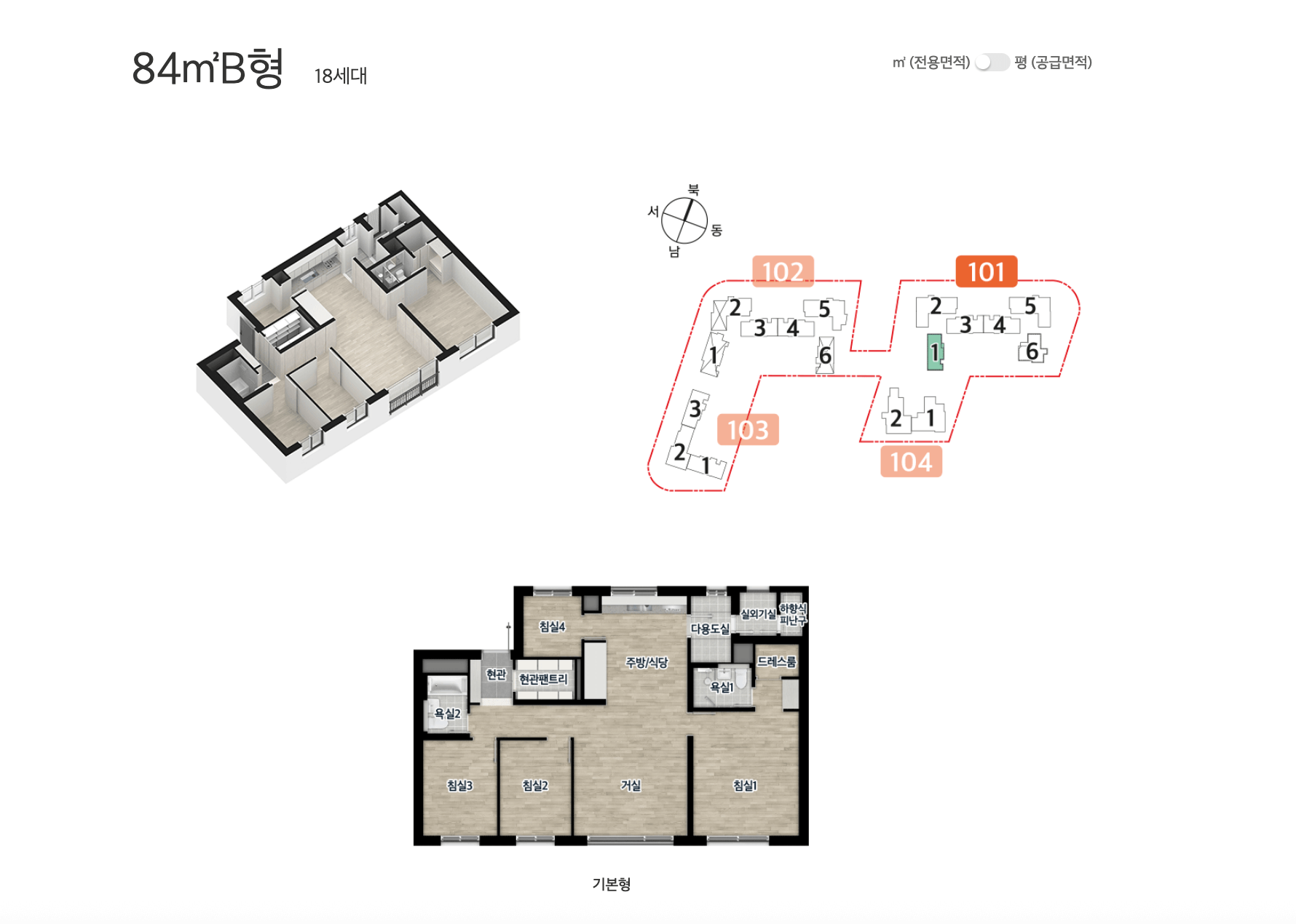 주력 타입인 84㎡는 4bay 판상형 구조로 설계돼 채광과 통풍이 우수하며, 방 3개, 욕실 2개로 실용적인 구성이 특징입니다.