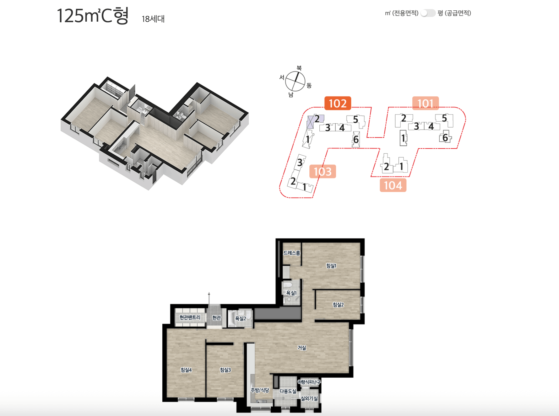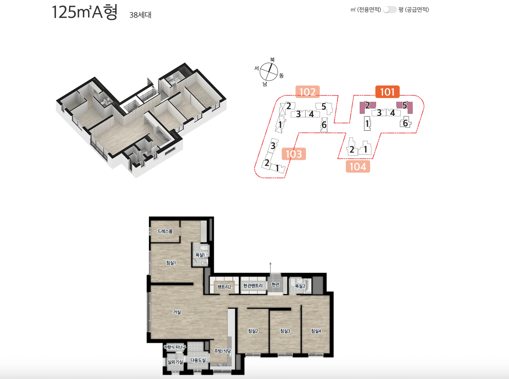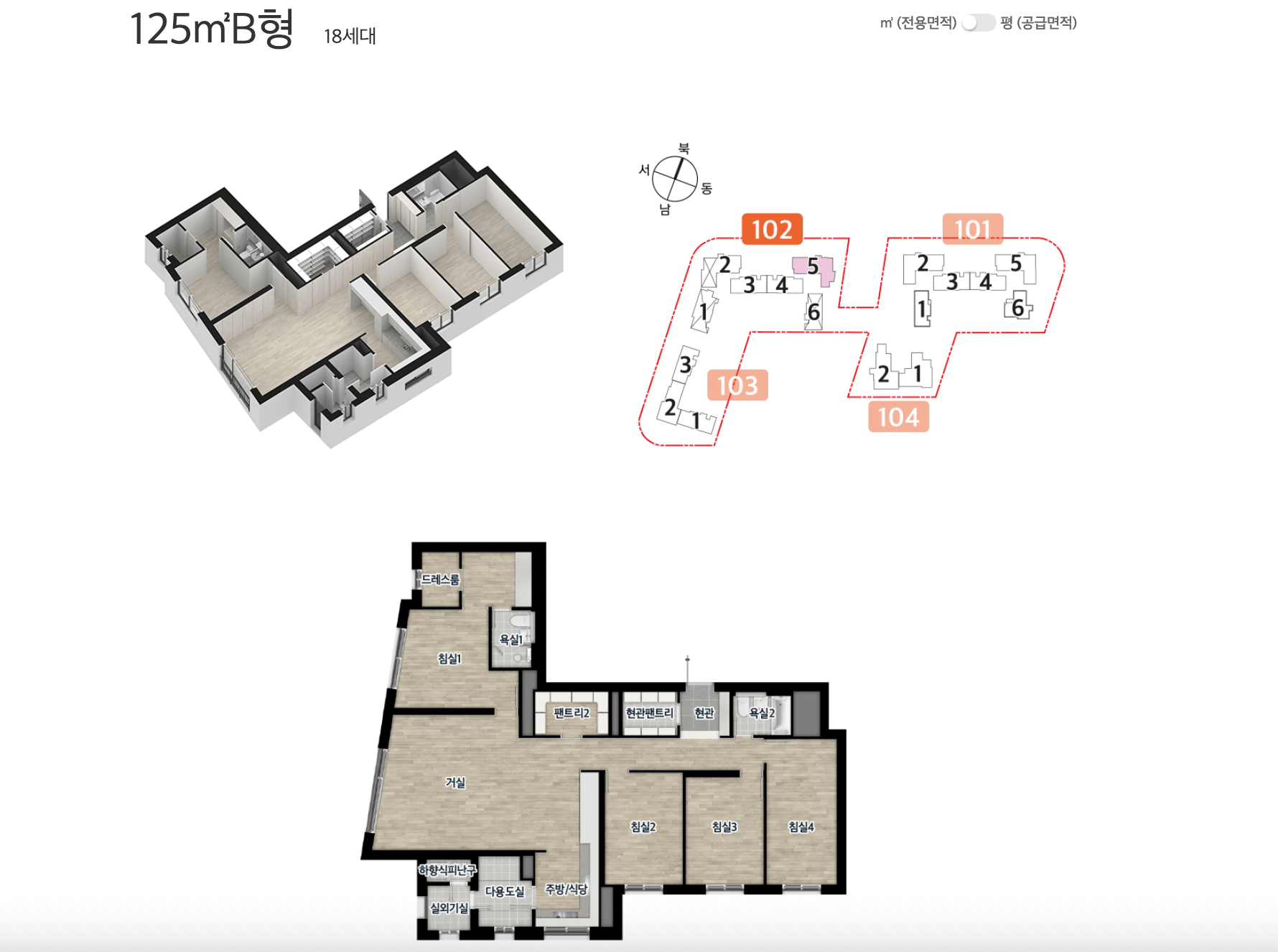 107㎡와 125㎡는 방이 4개인 대형 평면으로 거실 개방감이 크고, 실외기실과 발코니가 연결돼 공간 활용도를 높였습니다.