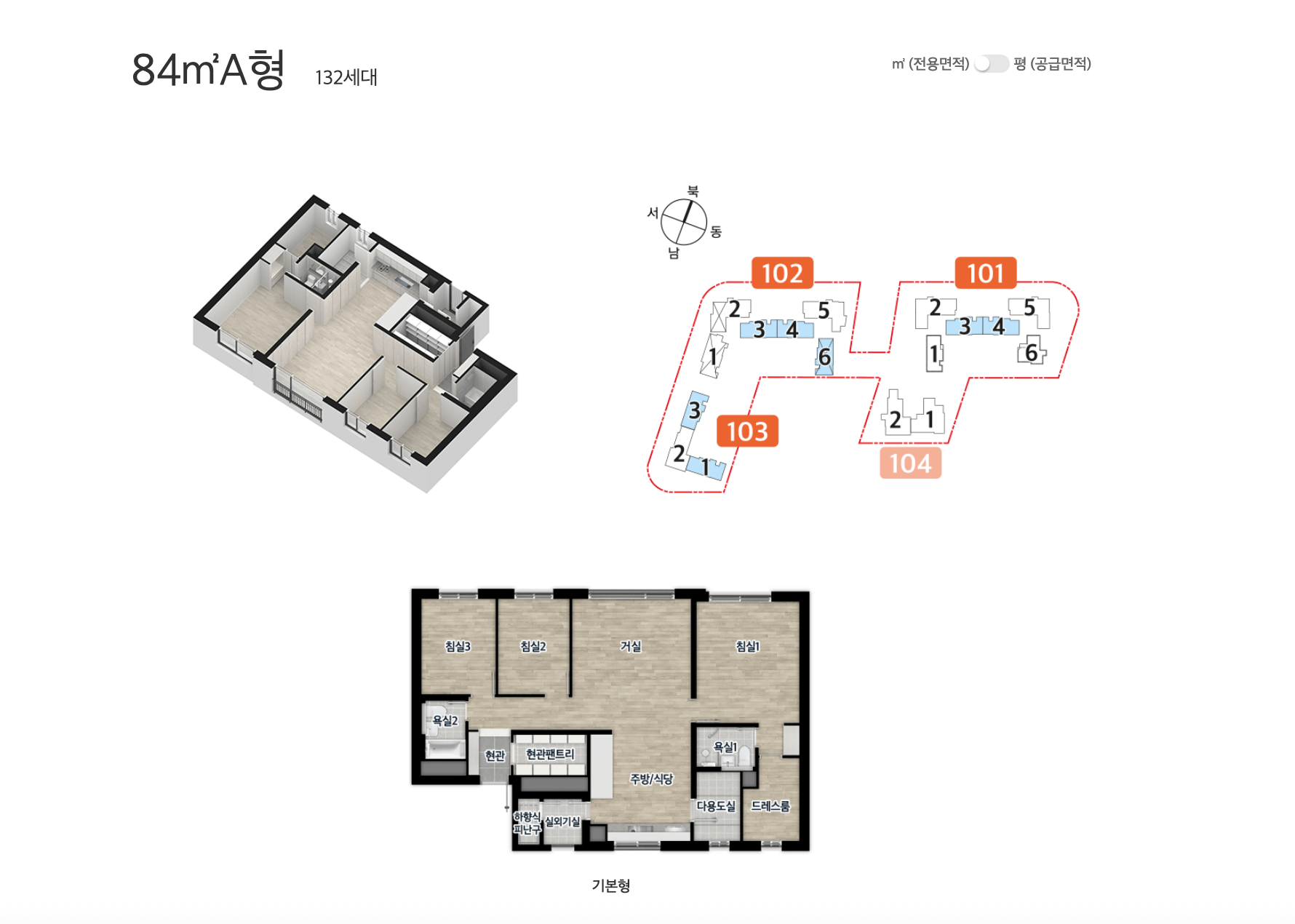 주력 타입인 84㎡는 4bay 판상형 구조로 설계돼 채광과 통풍이 우수하며, 방 3개, 욕실 2개로 실용적인 구성이 특징입니다.