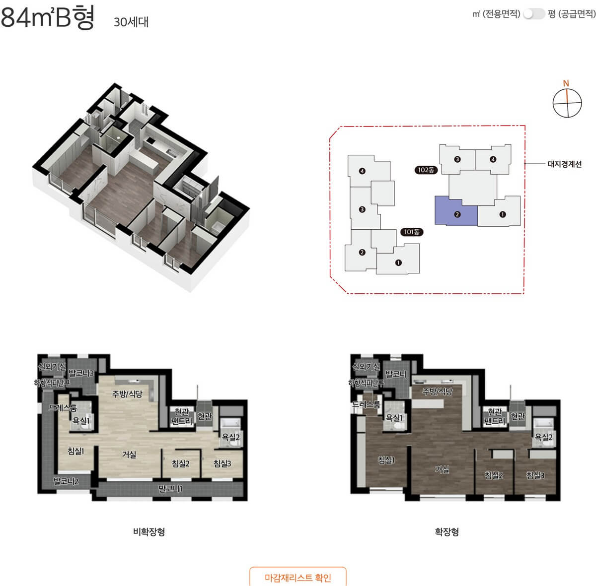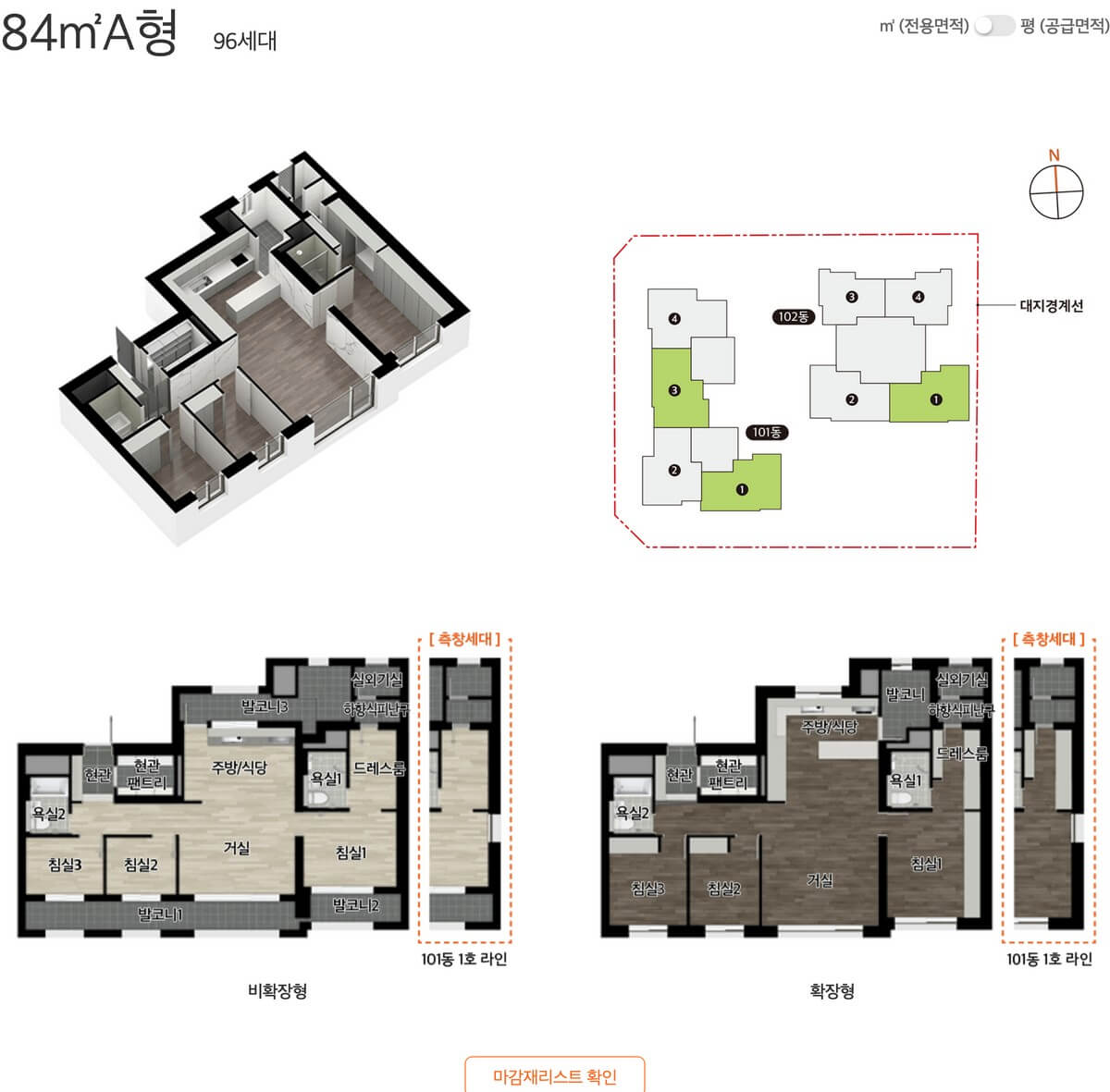 84A 타입은 96세대로, 거실과 방들이 모두 남향으로 배치된 4베이 판상형 구조입니다. 이런 구조는 채광과 환기에서 탁월하며, 넓은 거실과 효율적인 ㄱ자형 주방 동선으로 편리한 생활이 가능합니다. 또한 현관 팬트리, 발코니 드레스룸 등이 마련돼 넉넉한 수납공간을 제공합니다.
