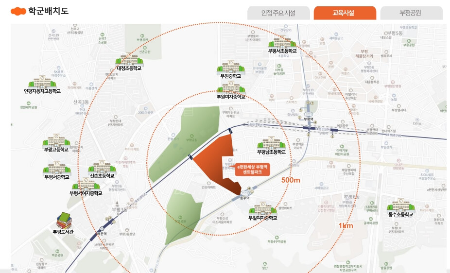 단지 인근에는 부평공원과 희망공원이 있어 자연을 가까이에서 느낄 수 있습니다. 특히, 부평공원은 지정 구역에서 그늘막 설치가 가능하여 더운 여름철에도 쾌적하게 시간을 보낼 수 있습니다. 또한, 단지 반경 1km 내에는 유치원, 초등학교, 중학교, 행정복지센터가 위치해 있어 교육 및 행정 서비스 접근성이 뛰어납니다. 대형마트, 아울렛, 부평역지하상가, 부평문화의 거리 등 주요 상권과 가톨릭대학교 인천성모병원도 가까워 생활의 편리함을 더합니다.
