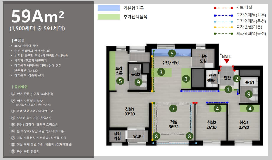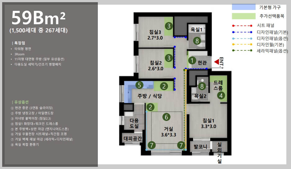 59㎡A 타입은 4베이 구조로, 49㎡ 타입보다 부부공간이 넓습니다. 부부방에 드레스룸과 파우더룸, 별도의 욕실이 있으며, 현관에는 신발장과 팬트리가 있어 실용성이 높습니다. 주방은 11자형 구조로 조리와 가족 대면이 용이합니다.