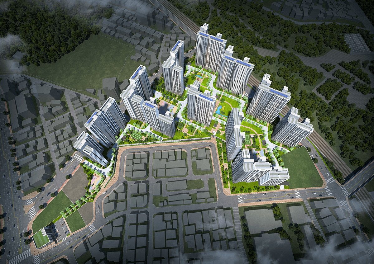 구성: 지하2층~최고층 30층, 13개 동 구성 총 1,500세대 중 457세대 일반분양 대진면적: 59,954㎡