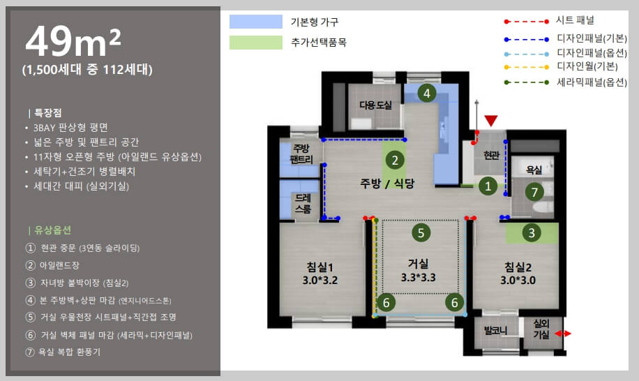 49㎡ 타입은 3 베이 평면구조로 침실 2개와 욕실 1개가 있습니다. 11자형 오픈스타일 주방과 안방 사이에 팬트리가 있어 수납공간이 충분하며, 부부방에는 별도의 드레스룸도 마련되어 있습니다.